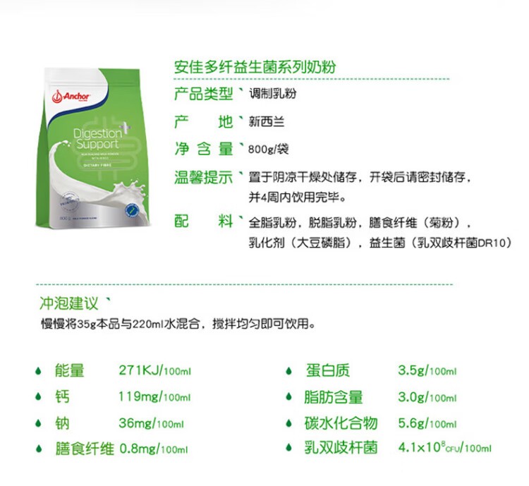 Anchor安佳/益生菌助消化奶粉800g/6袋装/26年12月(2周快线)