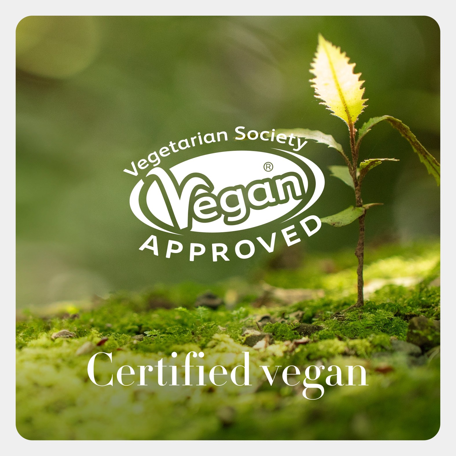 Certified vegan by VegSoc (the Vegetarian Society of the UK), the oldest and most respected vegetarian organisation in the world. Premium recyclable packaging: