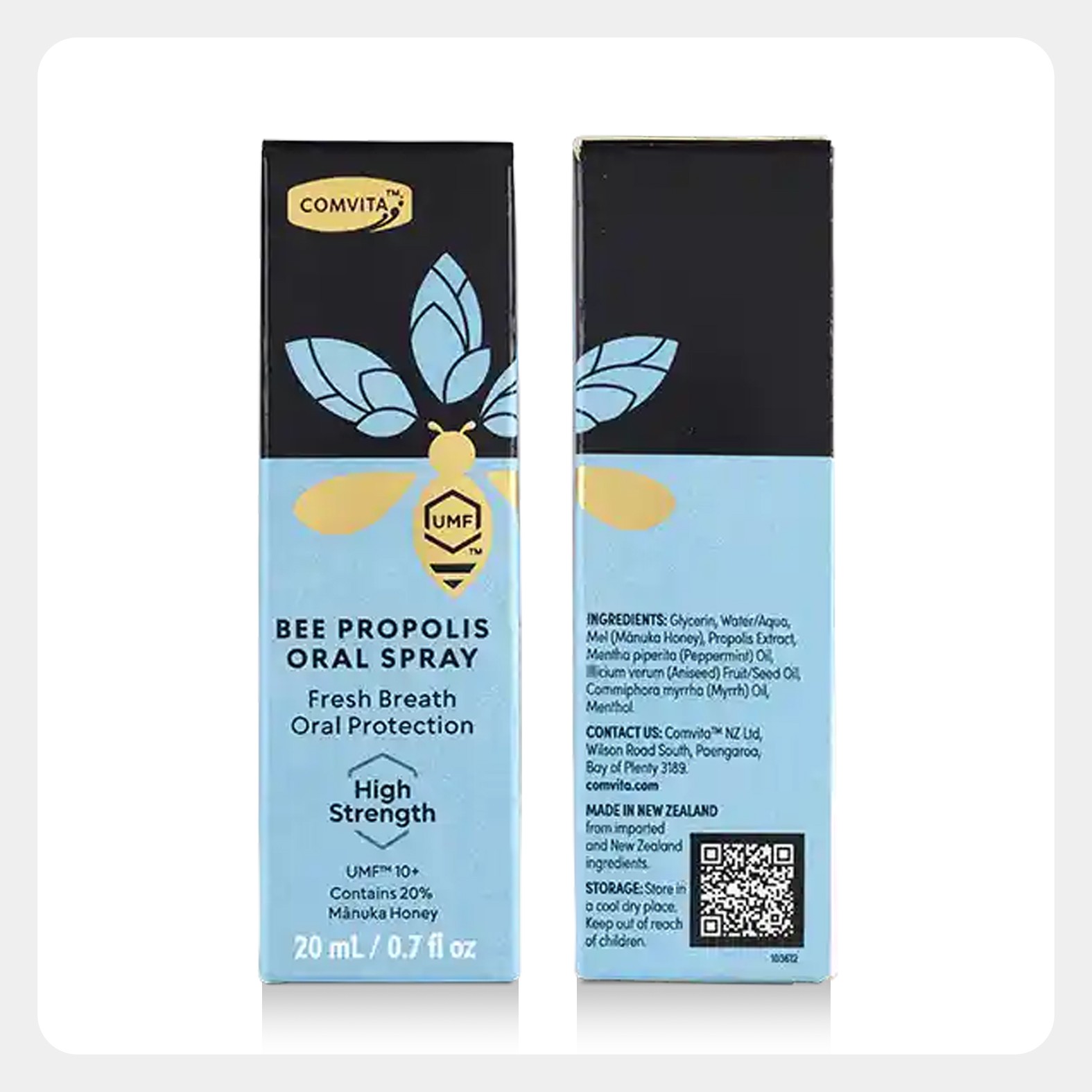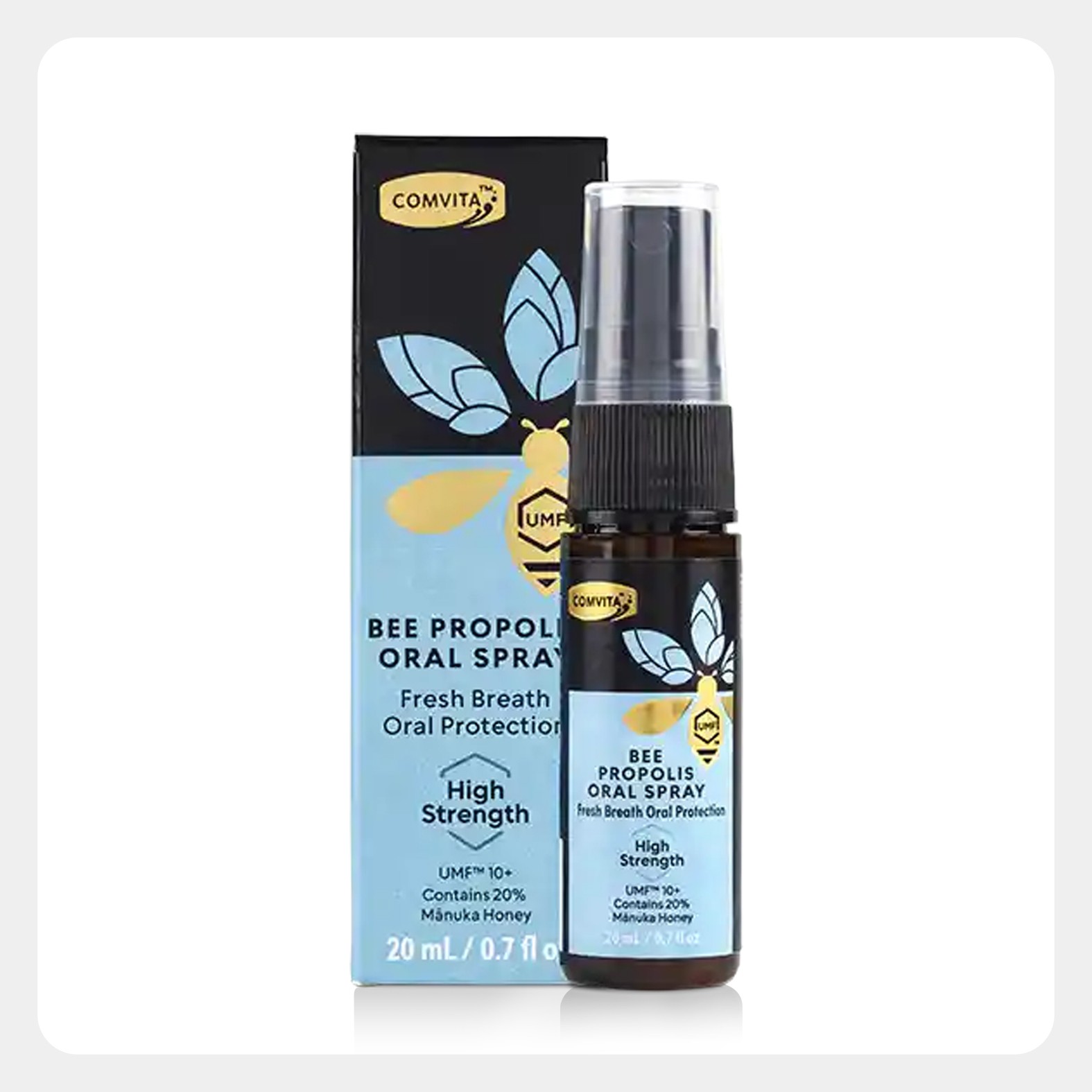 Support your Oral hygiene with Comvita Propolis Oral Spray High Strength. A natural, bee propolis Oral spray that helps fight odor causing bacteria, hydrates and freshens the mouth. Contains 20% manuka honey (UMF10+) for extra immune boosting antioxidants to strengthen your natural defenses.