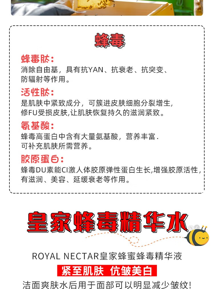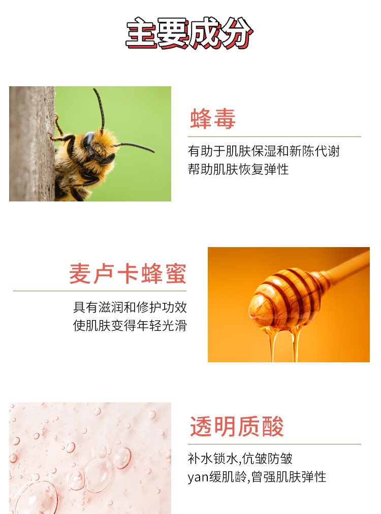 由蜂毒和活性麦卢卡蜂蜜混合而成,可刺激皮肤,快速抗衰老,调理和平衡肌肤,控油同时并舒缓干燥区域,让肌肤感觉清新光滑,新西兰原装直邮
